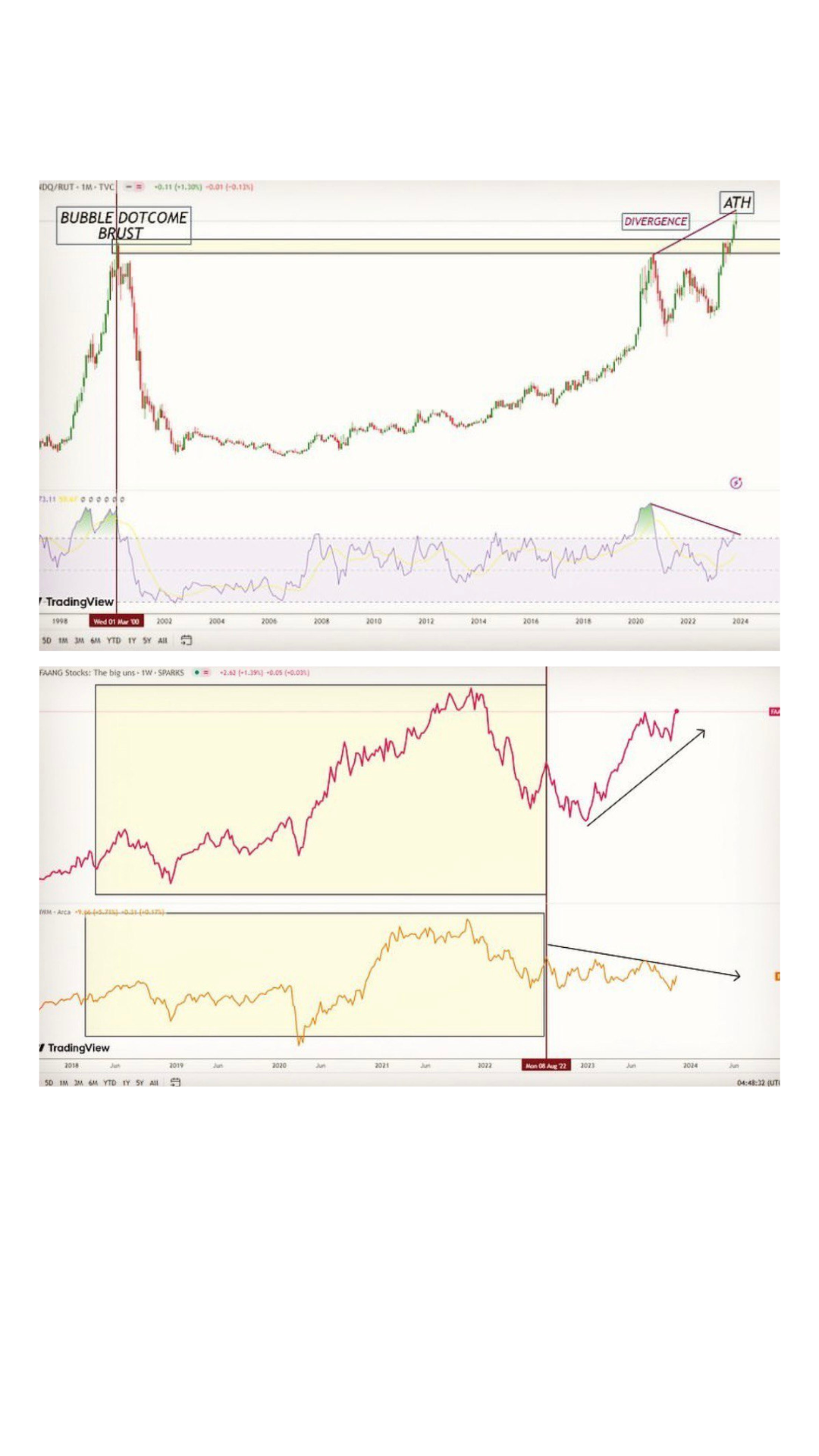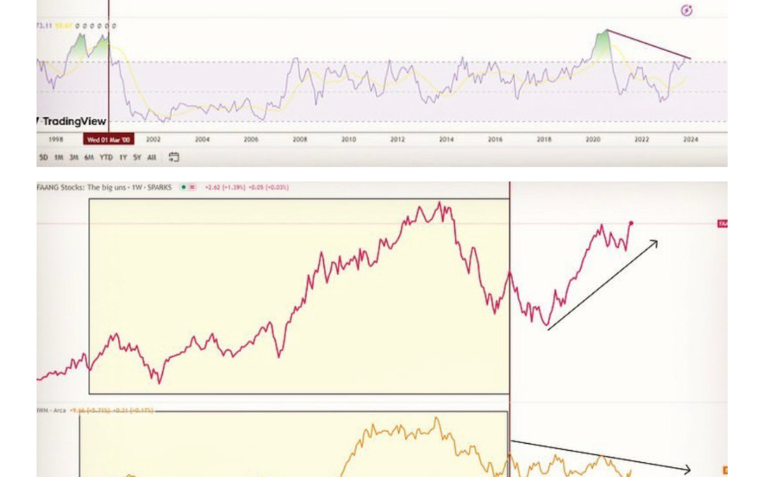 The proximity ratio of the Nasdaq to the Russell 2000 (NDQ/RUT) has surpassed the historical bubble.com area of 2000 and reached a new record high. This is happening while the Nasdaq has not reached its historical high, and the Russell 2000 small-cap index is experiencing a decline. If we look at the second chart over a period of time, there is a significant divergence between the FAANG index, consisting of large-cap U.S. stocks, and the Russell 2000 index, representing small-cap U.S. stocks. It appears that the seven large-cap stocks alone are driving the growth in the indices, and on the other hand, they seem to have reached overvaluation levels. In my opinion, equity indices have reached the end of a major growth cycle, and we might witness a decline in stock indices and a devaluation of the Russell 2000 index in the coming year.